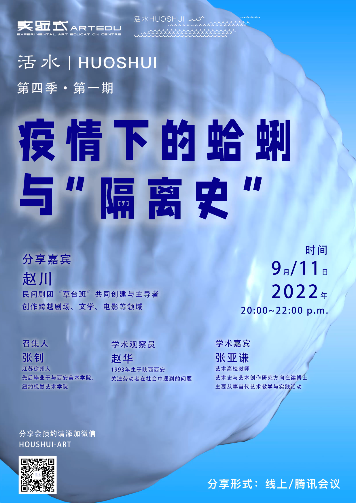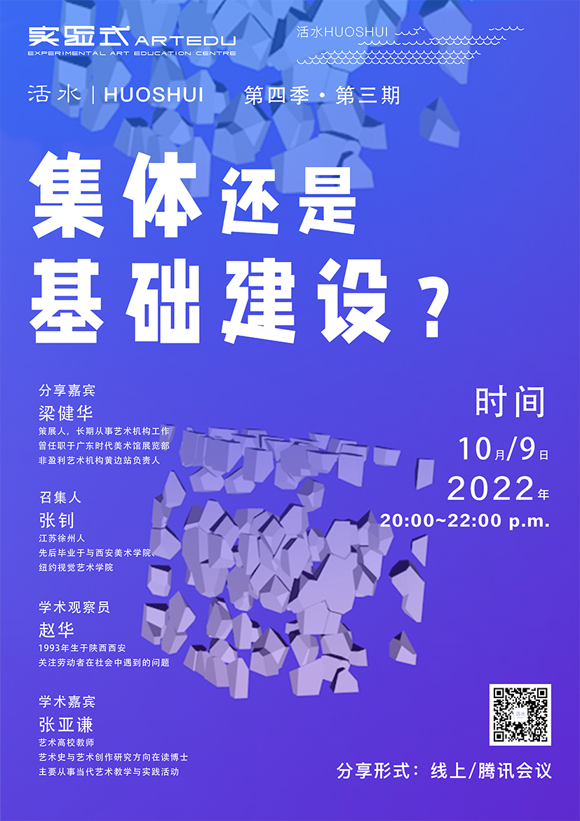 The art world is no different. The past path has been potholed, and in the confines of a brief encounter with new problems, artists are bound to make changes as well. On the one hand, when "in-person" is blocked, what are the challenges to the " live" and " local" that performance, theater, and community artists/art organizations emphasize? On the other hand, how do new media and digital artists extend their artistic practices when the "network" is thickened into life during the pandemic? In this talk series, I will invite eight artists and organizers active in theater, performance, social practice, new media, and digital art to introduce their work status, methods, experiences, and reflections since the pandemic.